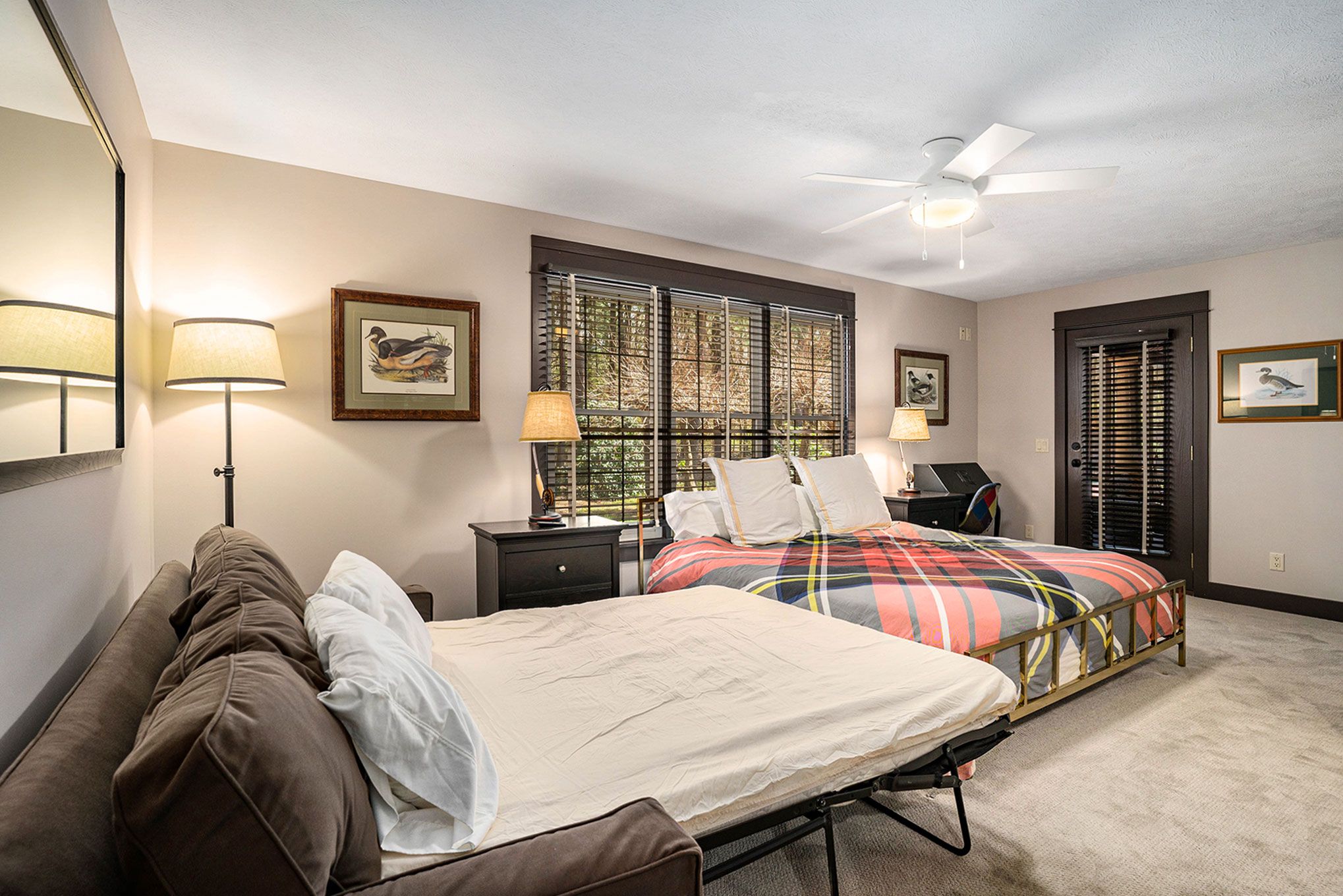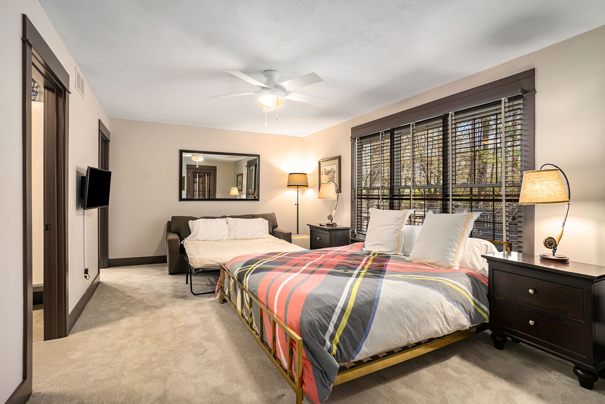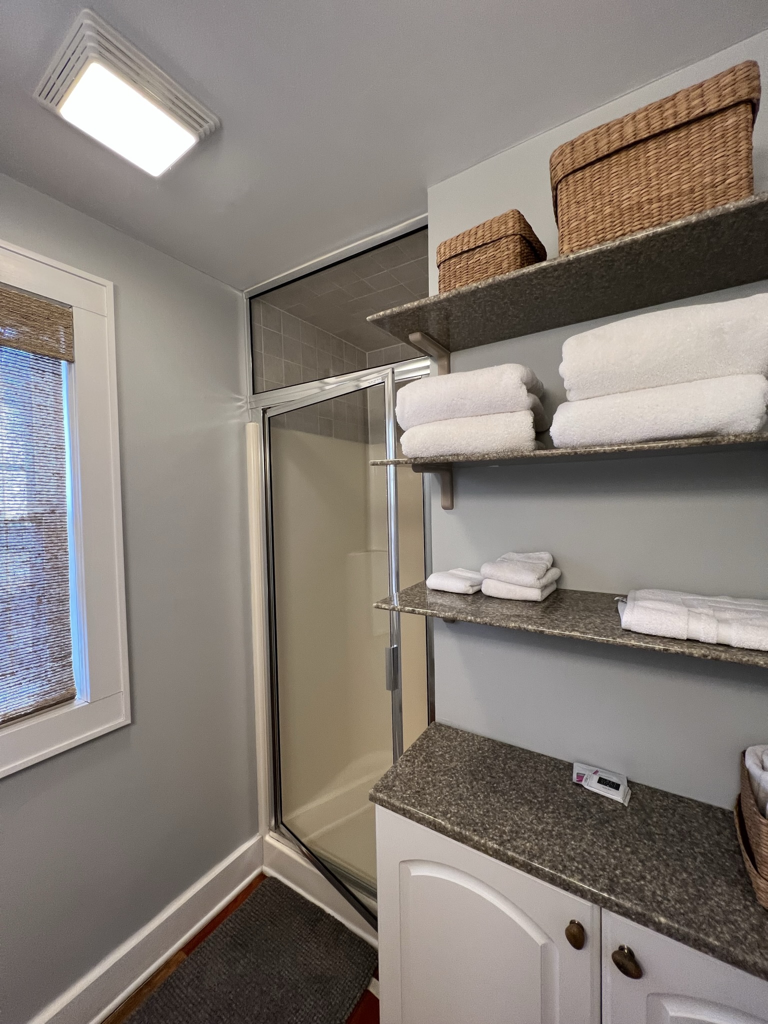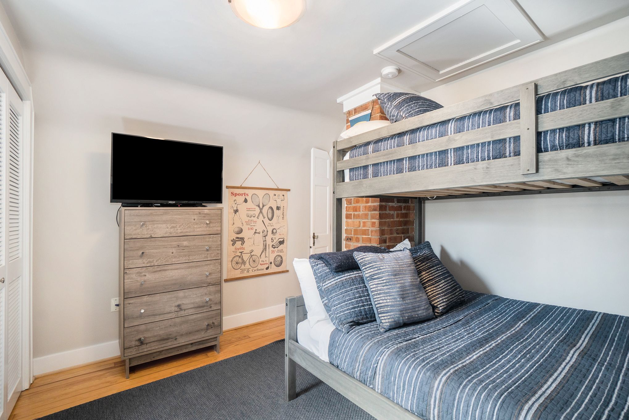 The main floor primary bedroom has a king bed, pull out sofa bed, and en-suite bathroom with a stand in shower. The screen porch is also accessible from the master bedroom. The guest bedroom has a number of sleeping options with a queen bed and queen-stacked bunk beds. The adjacent hallway bathroom has a shower and tub. The upstairs offers a secondary suite. This room has a queen bedroom, en suite bathroom with stand in shower and a walkout balcony with views of the wooded backyard and pool. Café seating makes it a perfect spot for quiet reading and morning coffee. Each bedroom has a flat screen TV with cable. In total, our home can accommodate up to 12 guests.
