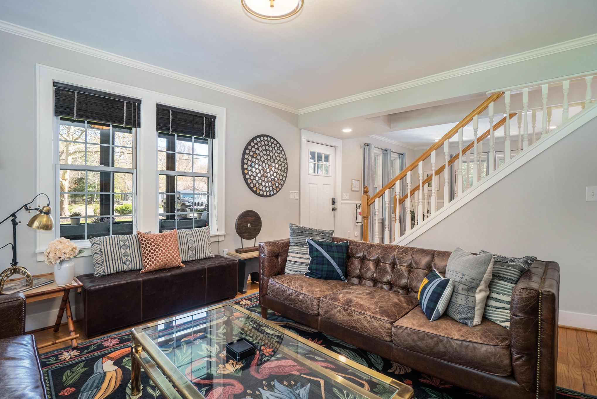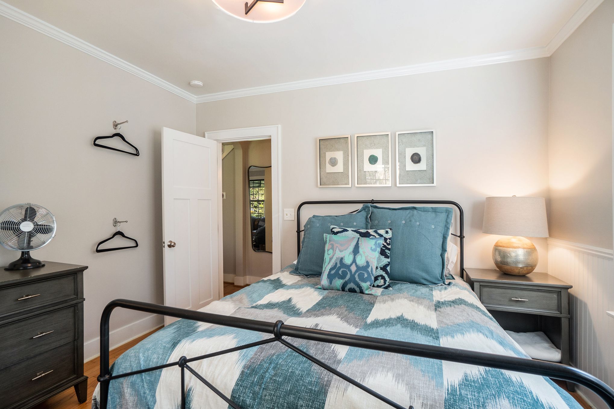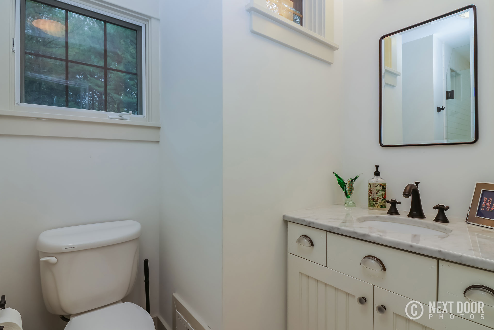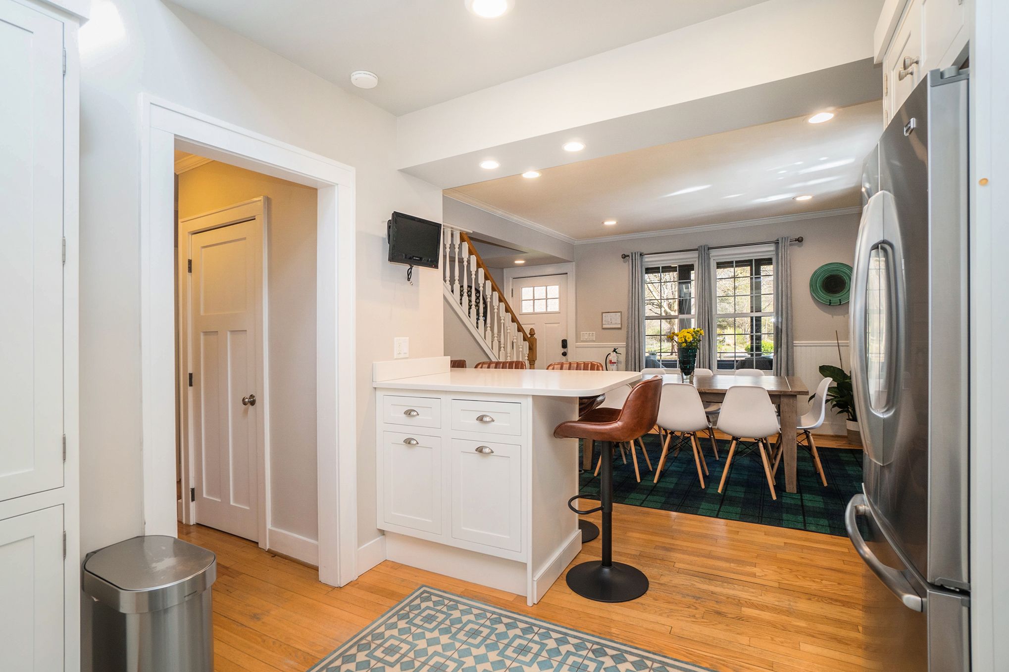 The main floor primary bedroom has a king bed, pull out sofa bed, and en-suite bathroom with a stand in shower. The screen porch is also accessible from the master bedroom. The guest bedroom has a number of sleeping options with a queen bed and queen-stacked bunk beds. The adjacent hallway bathroom has a shower and tub. The upstairs offers a secondary suite. This room has a queen bedroom, en suite bathroom with stand in shower and a walkout balcony with views of the wooded backyard and pool. Café seating makes it a perfect spot for quiet reading and morning coffee. Each bedroom has a flat screen TV with cable. In total, our home can accommodate up to 12 guests.