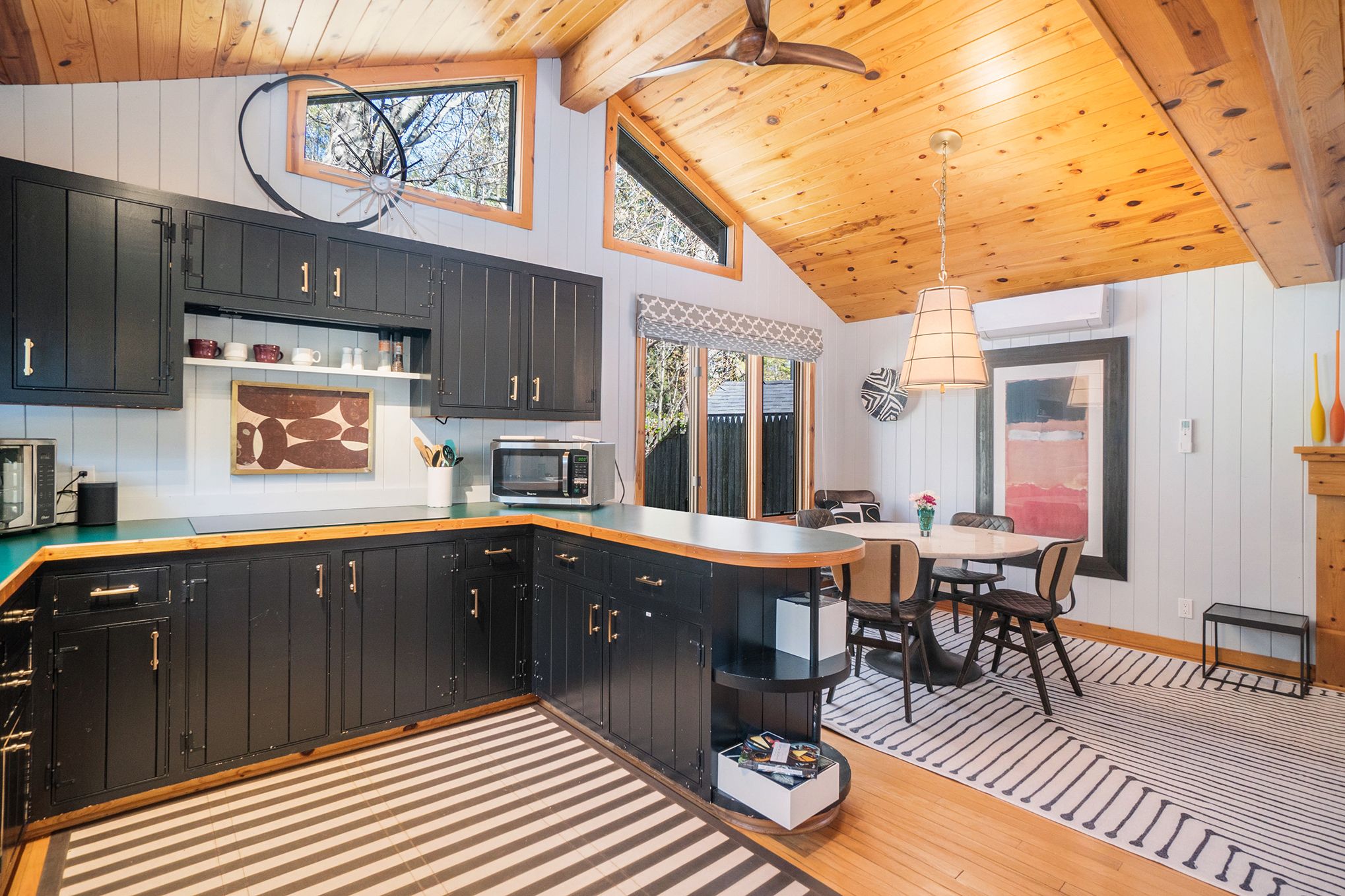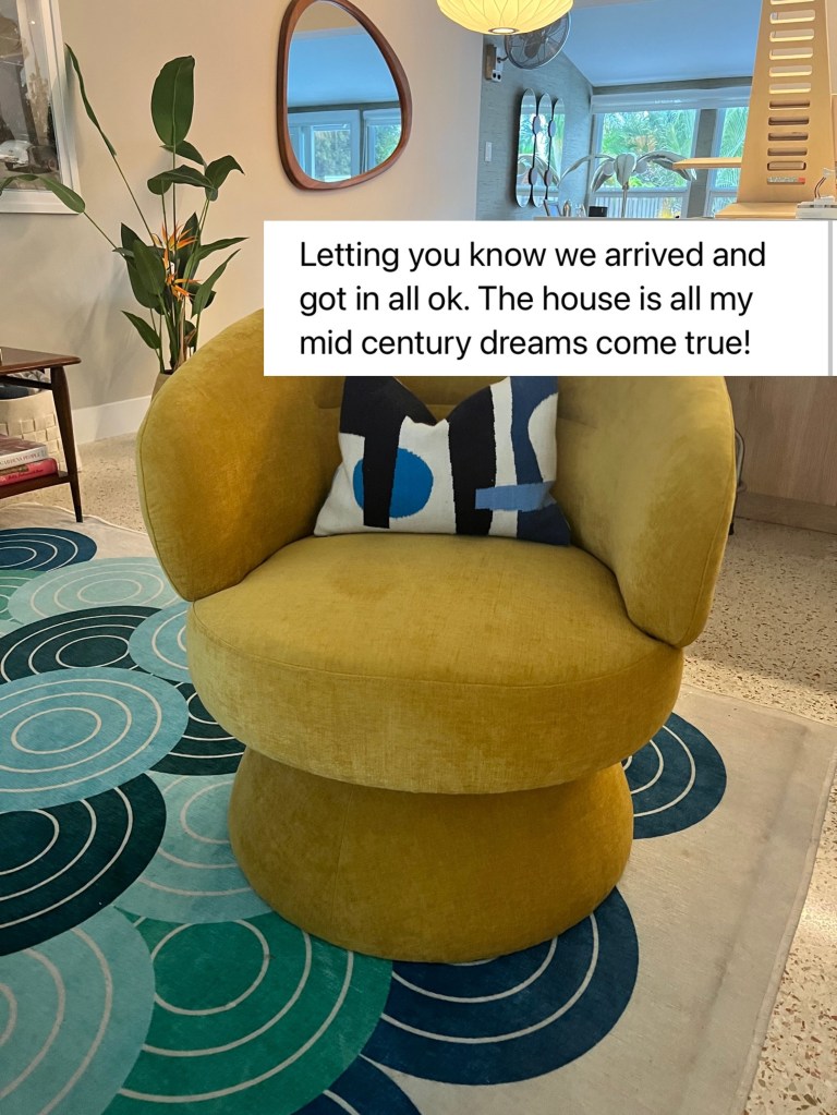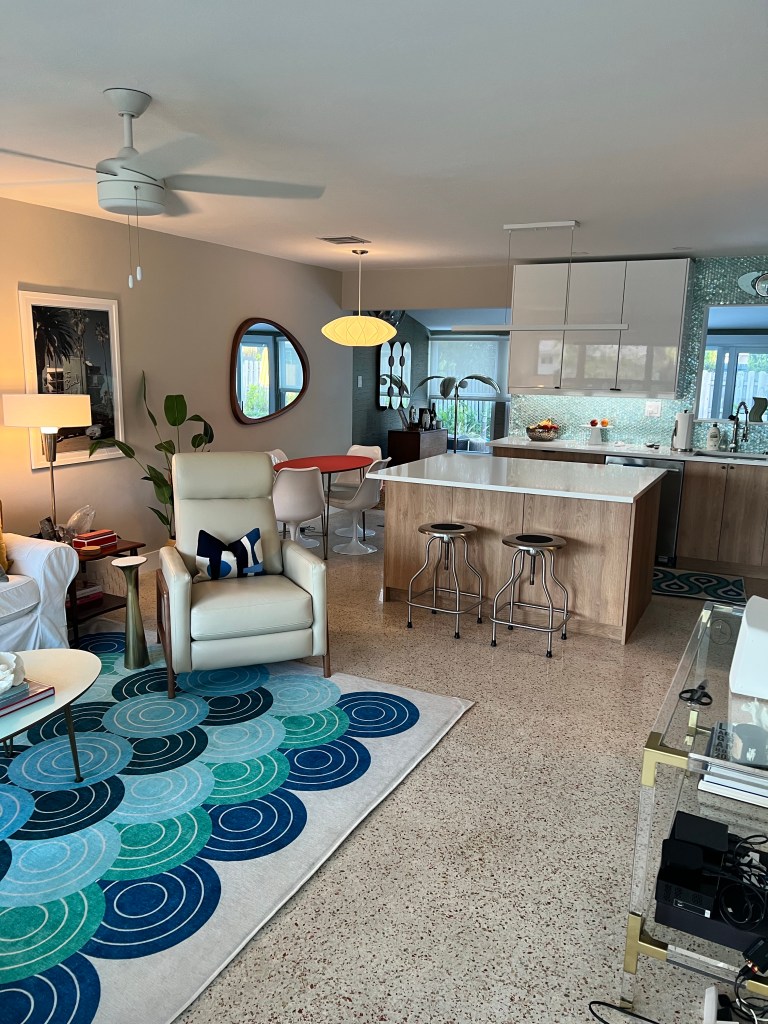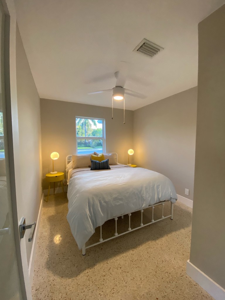 The kitchen is outfitted with vintage-look lemonade yellow appliances and offers enough room for meal preparation. The long dining table offers plenty of seating and views of the pool, which “wets” the appetite- not for food but for a dip!