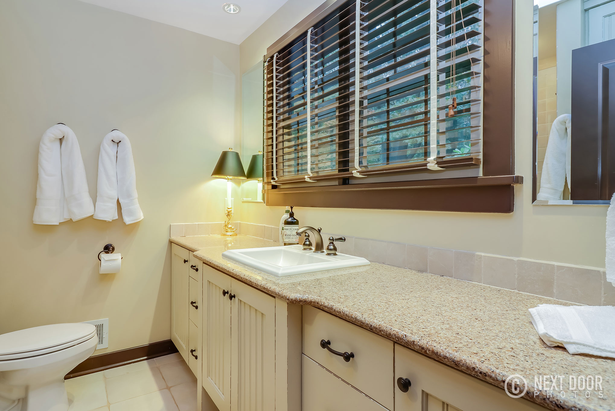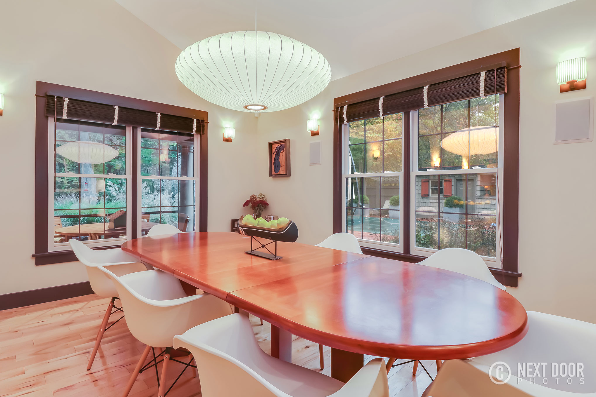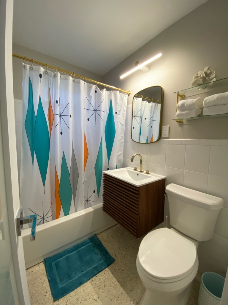 The kitchen is outfitted with vintage-look lemonade yellow appliances and offers enough room for meal preparation. The long dining table offers plenty of seating and views of the pool, which “wets” the appetite- not for food but for a dip!