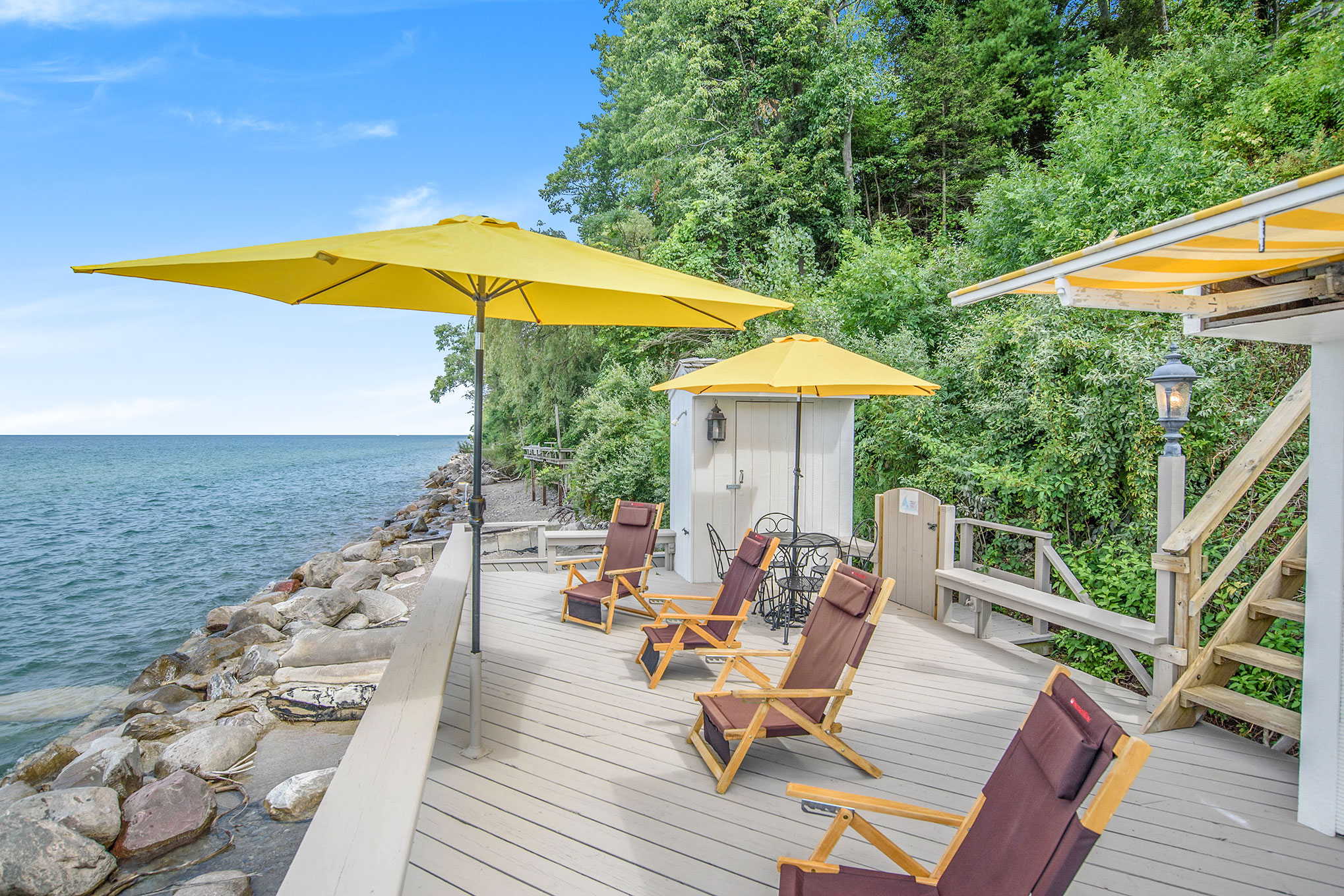 The umbrella patio table and hammocks will draw you outside to enjoy the Lake Michigan views. The descending steps will take you to water level for glorious sunbathing and sunset viewing. The home has 100’ of private lake shore. In short, our outdoor area takes full advantage of the views: A lakeside deck, 8-person hot tub, and lakeside Firepit. S’mores anyone?