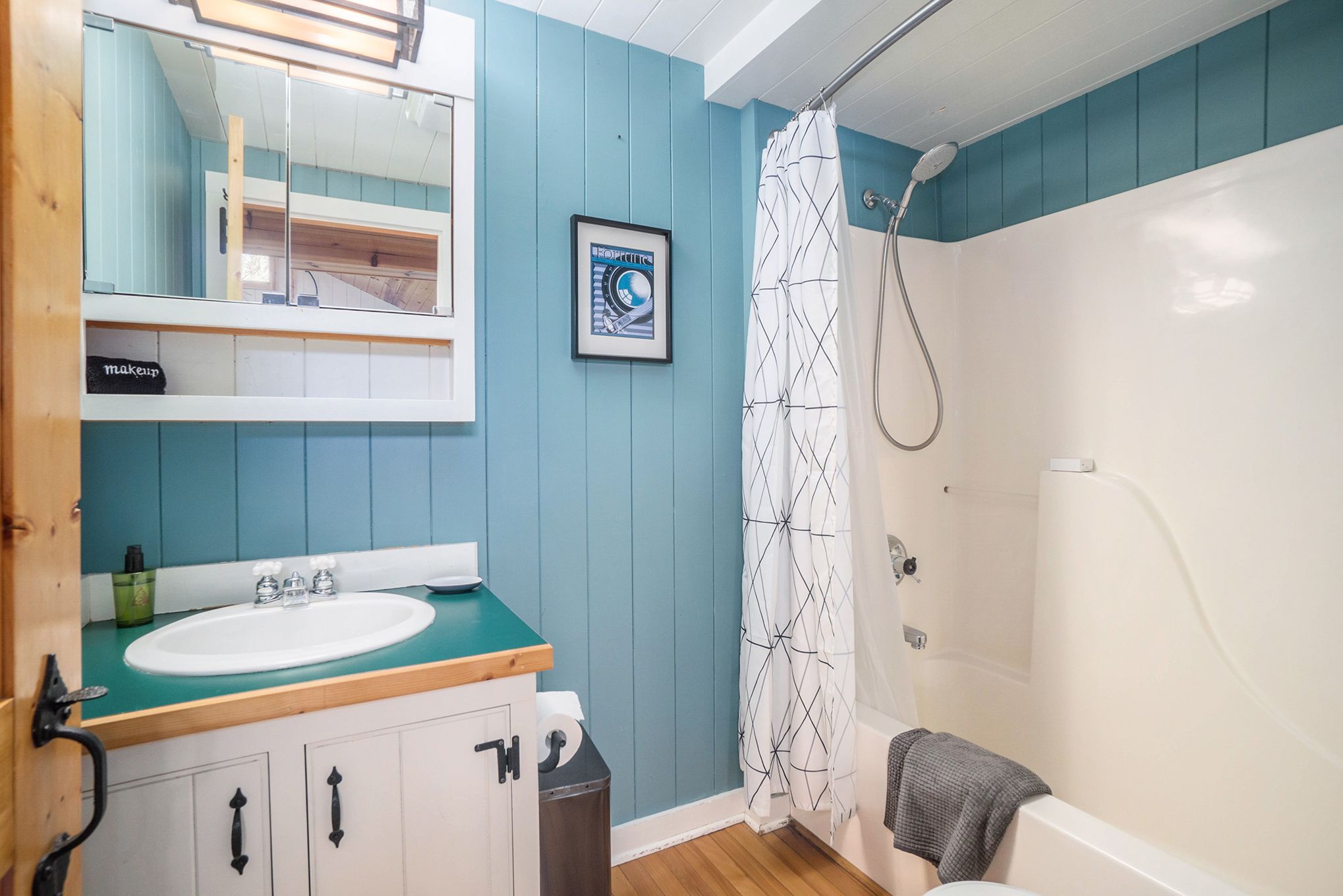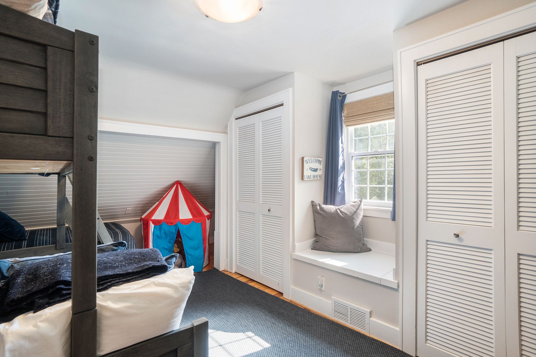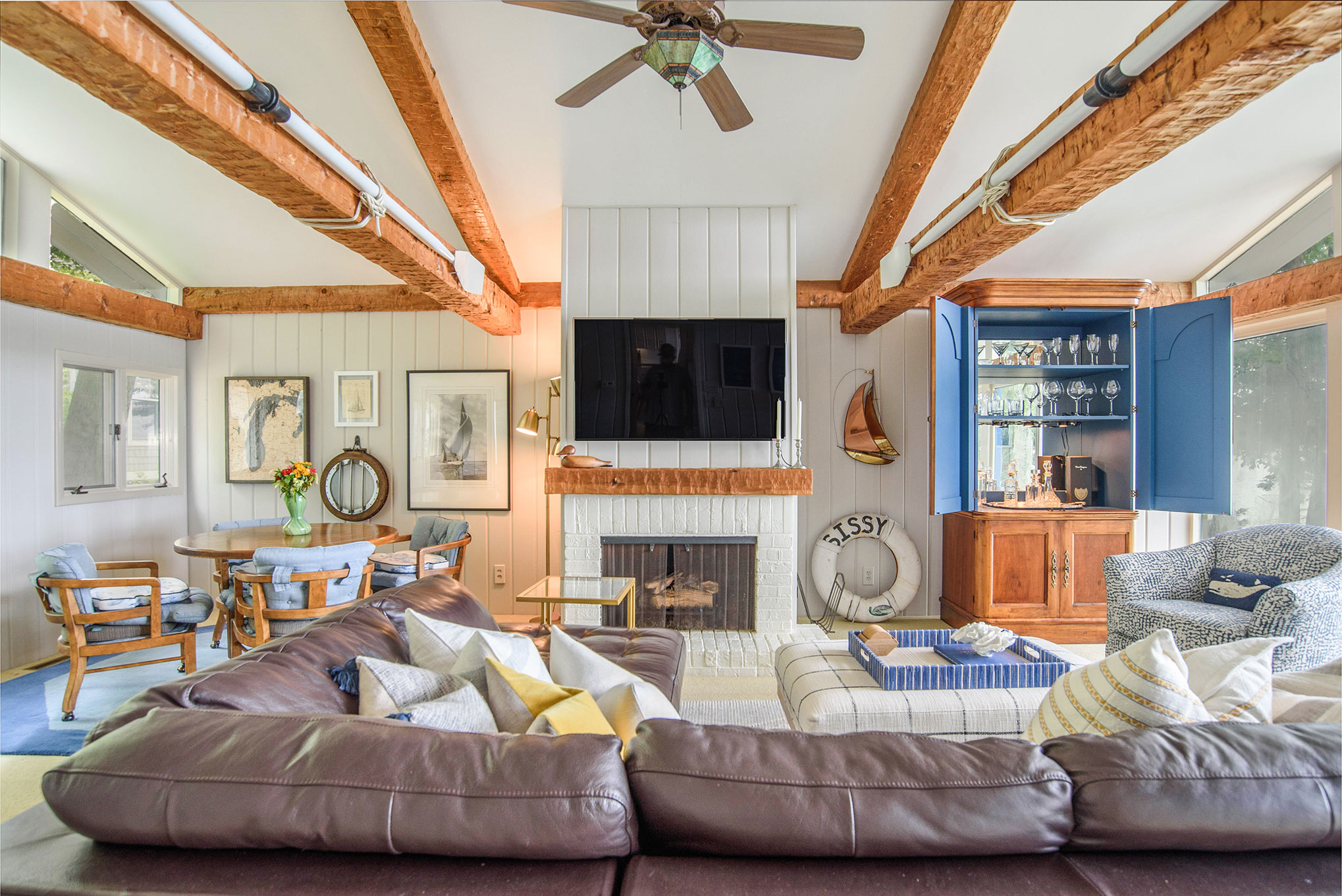 This four bedroom/four-bath, nautically-themed cottage offers a King Size bed and Murphy bed in the Primary ensuite-bedroom upstairs. The second level has two additional bedrooms both with Queen beds and a shared bathroom. A separate wing houses a loft bedroom with Queen bed and trundle bed. The entire family compound sleeps 12.