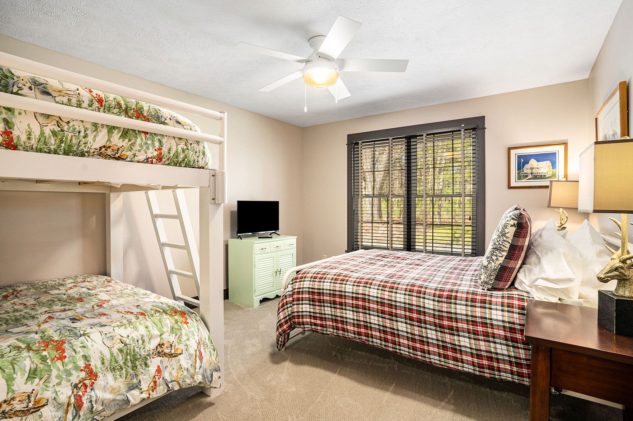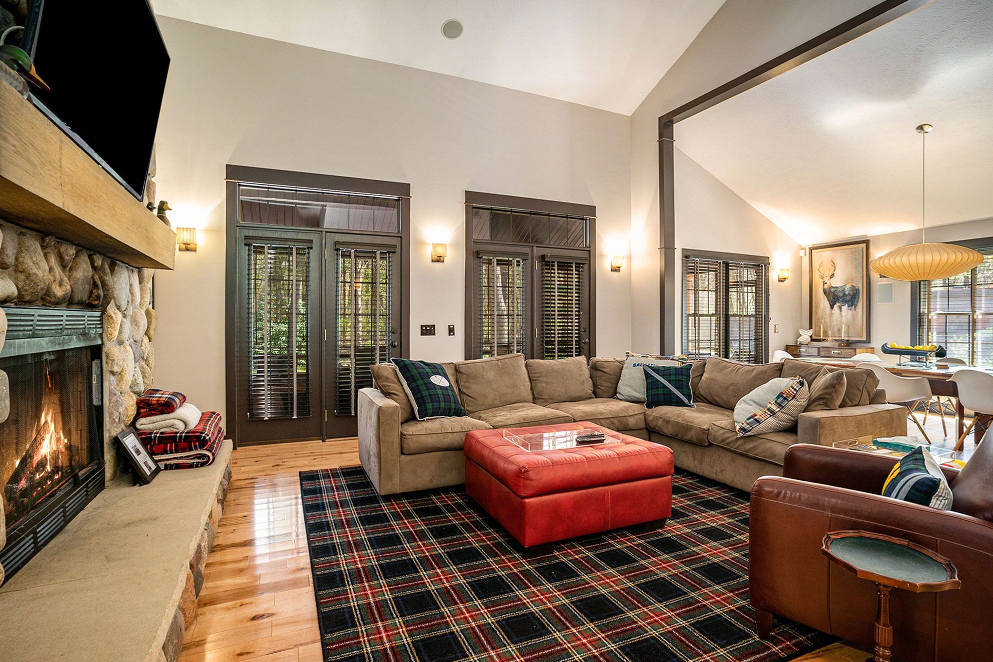 Tucked in its own enclave of lofty greenery the dark shake siding exterior is accented with coral red shutters. Inside– the lodge theme really takes shape when you see the vaulted living room and towering stone hearth fireplace. Contemporary accents depicting woodland creatures contribute to the theme that is lighthearted and welcoming.